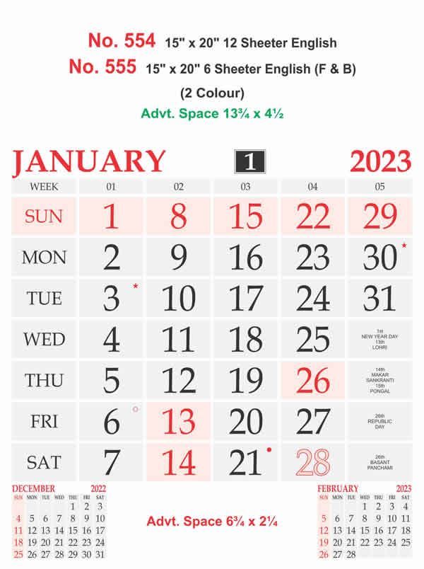 Key Features of R554 English - 15x20" 12 Sheeter Monthly Calendar Printing 2023