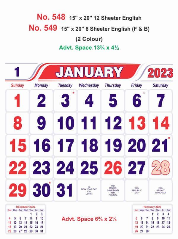 R548 English - 15x20" 12 Sheeter Monthly Calendar Printing 2023