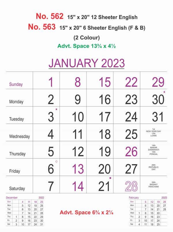 R562 English - 15x20" 12 Sheeter Monthly Calendar Printing 2023