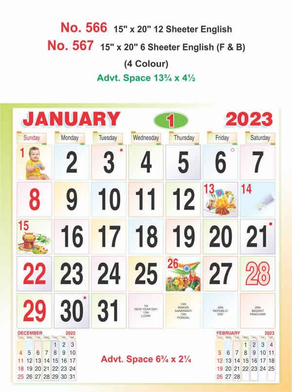 R566 English - 15x20" 12 Sheeter Monthly Calendar Printing 2023