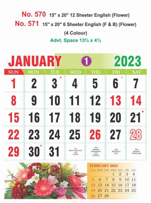 R570 English(Flower) - 15x20" 12 Sheeter Monthly Calendar Printing 2023