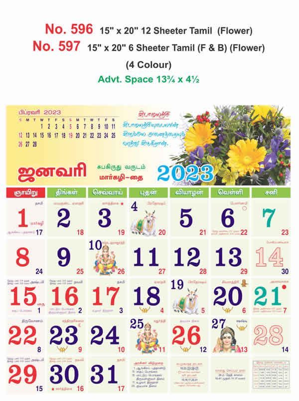 R596 Tamil(Flower) - 15x20" 12 Sheeter Monthly Calendar Printing 2023