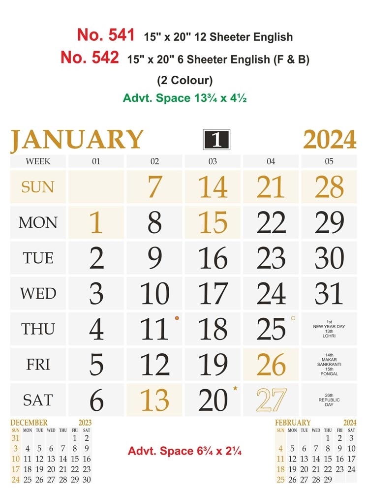 Key Features of R541 English - 15x20" 12 Sheeter Monthly Calendar Printing 2024