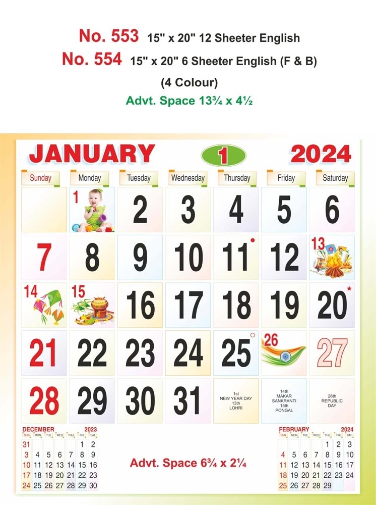Key Features of R553 English - 15x20" 12 Sheeter Monthly Calendar Printing 2024