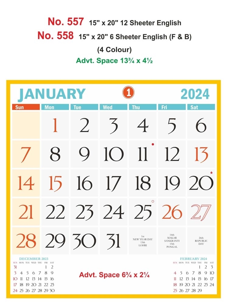 Key Features of R557 English - 15x20" 12 Sheeter Monthly Calendar Printing 2024
