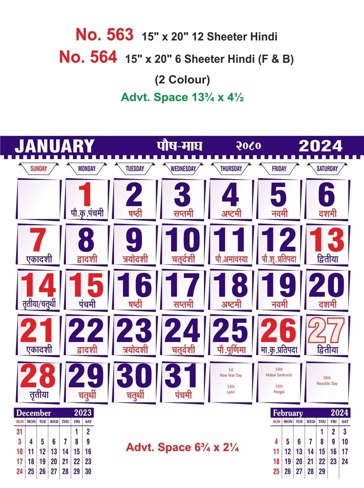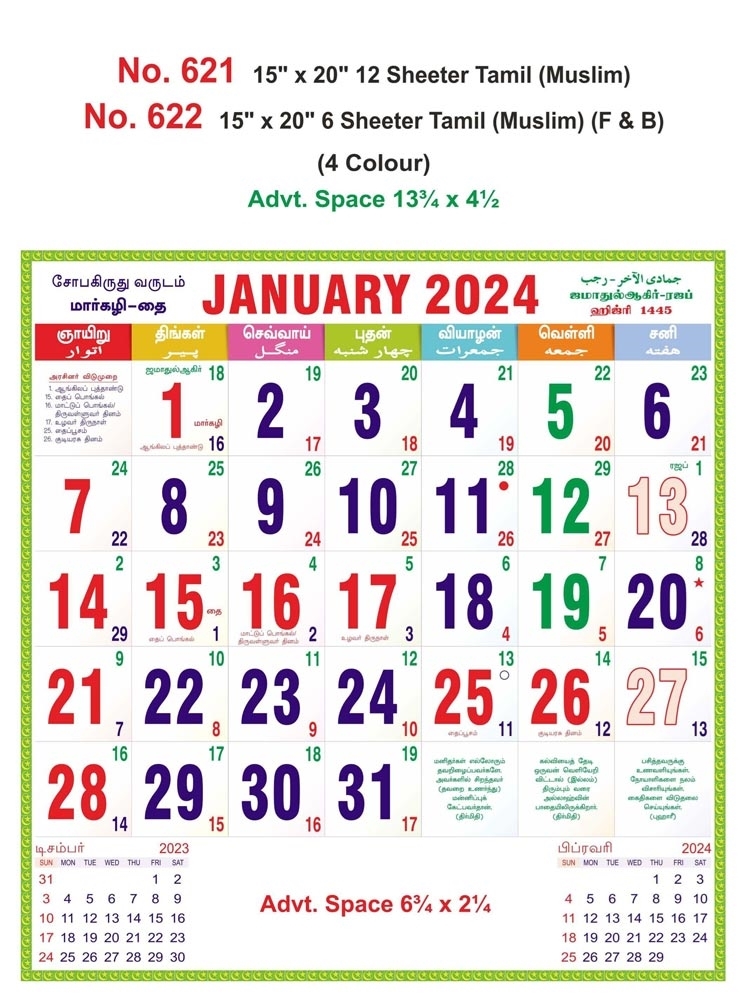 R613 Tamil - 15x20" 12 Sheeter Monthly Calendar Printing 2024