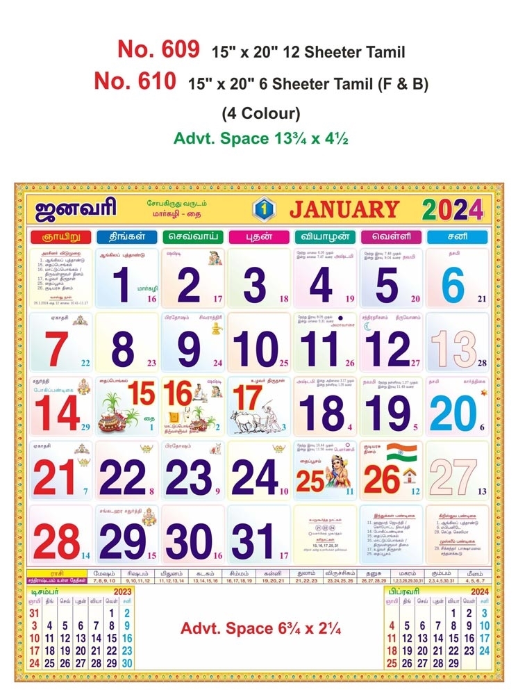 R609 Tamil - 15x20" 12 Sheeter Monthly Calendar Printing 2024