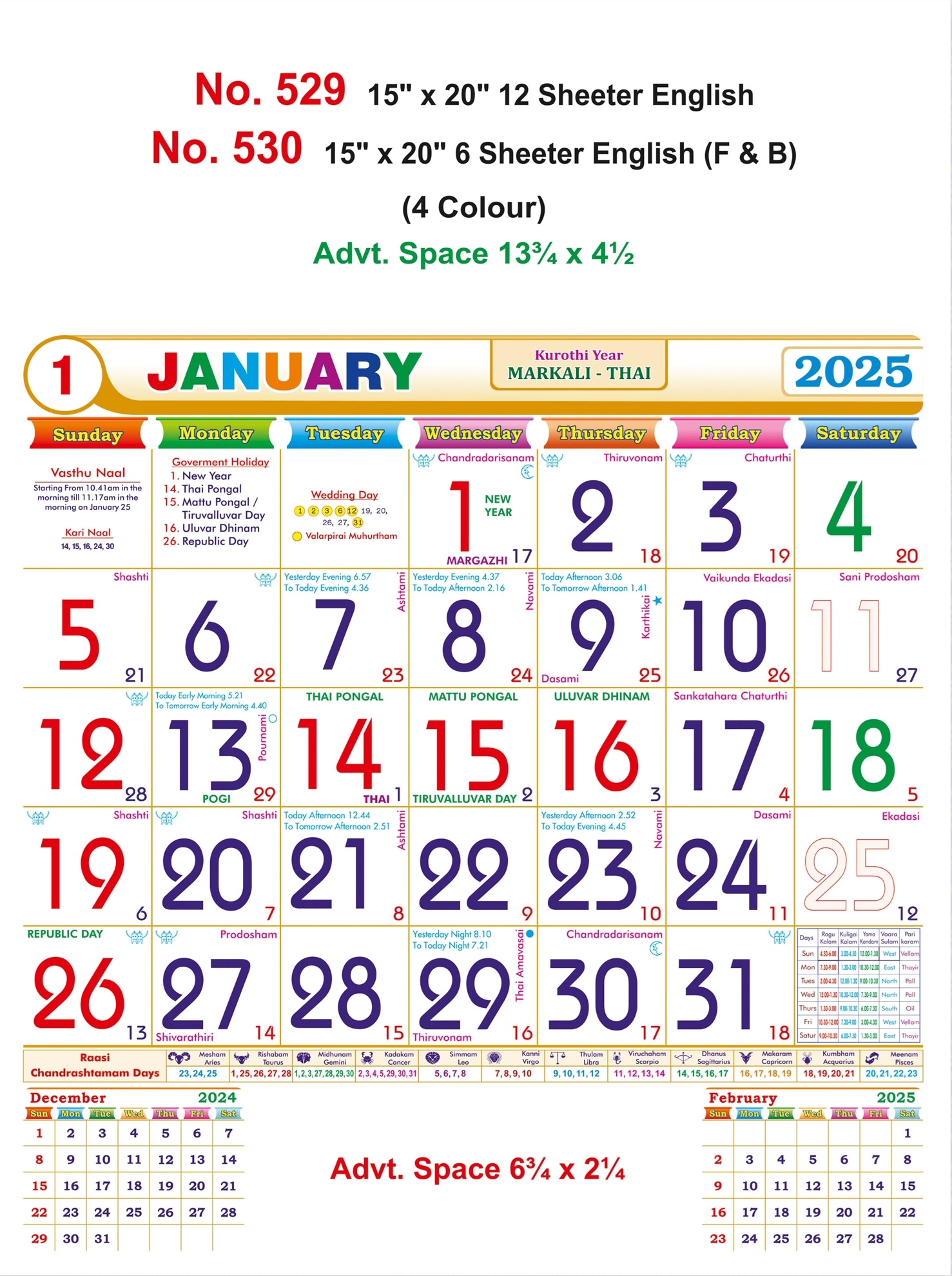 Products specifications R529 English Panchangam - 15x20" 12 Sheeter Monthly Calendar Printing 2025
