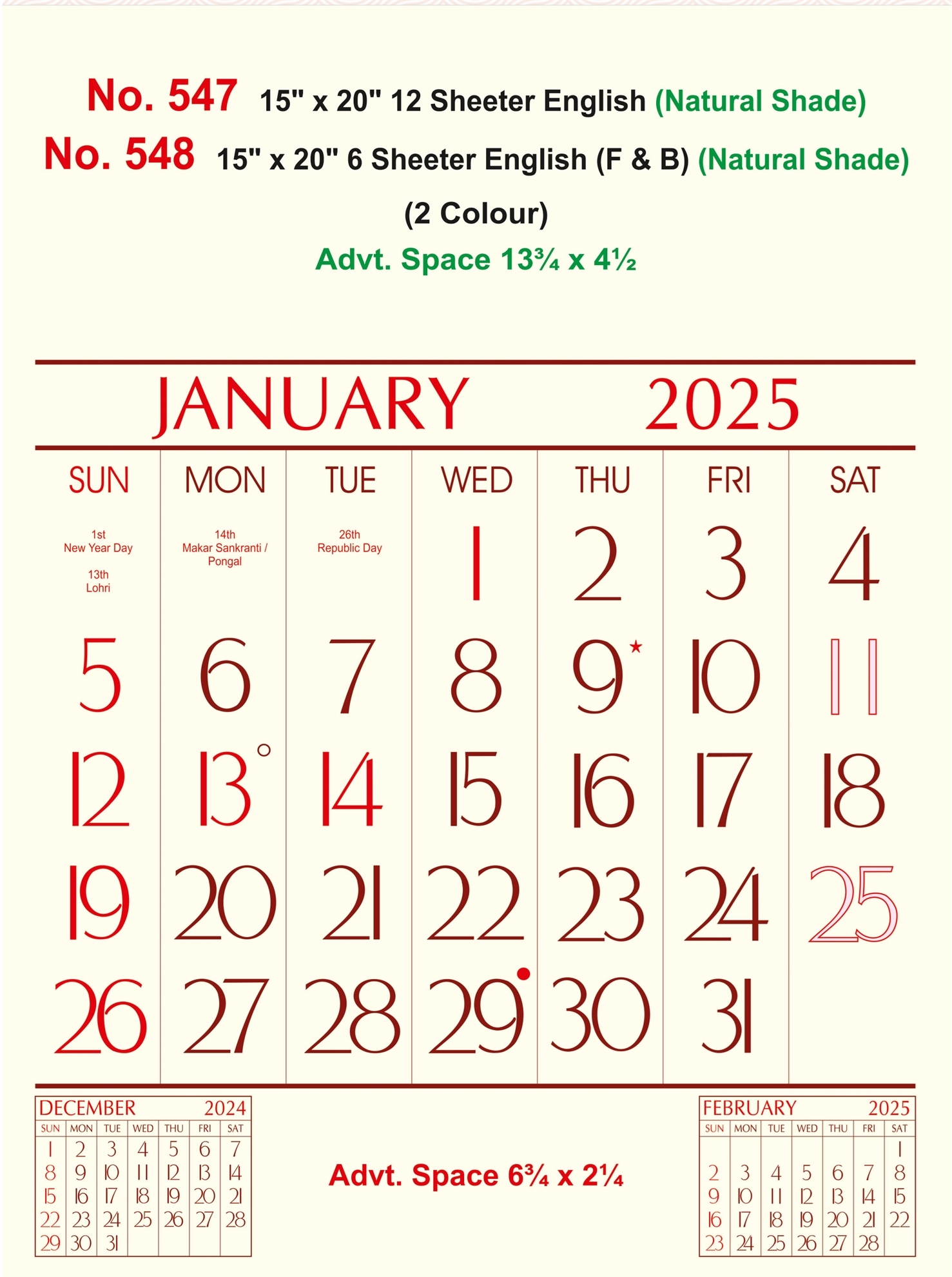 R547 English (Natural Shade) - 15x20" 12 Sheeter Monthly Calendar Printing 2025