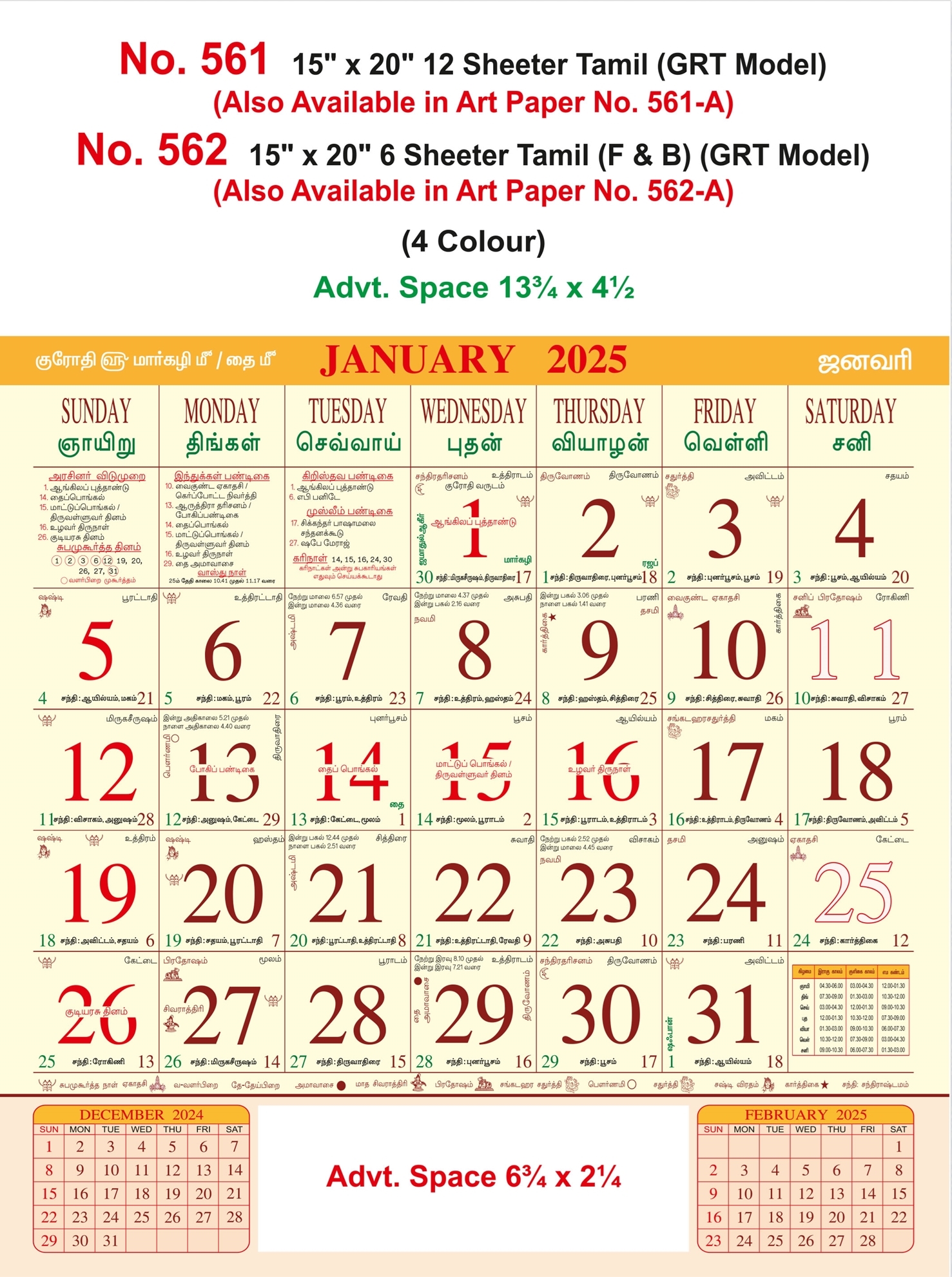 R561 Tamil (GRT Model) - 15x20" 12 Sheeter Monthly Calendar Printing 2025