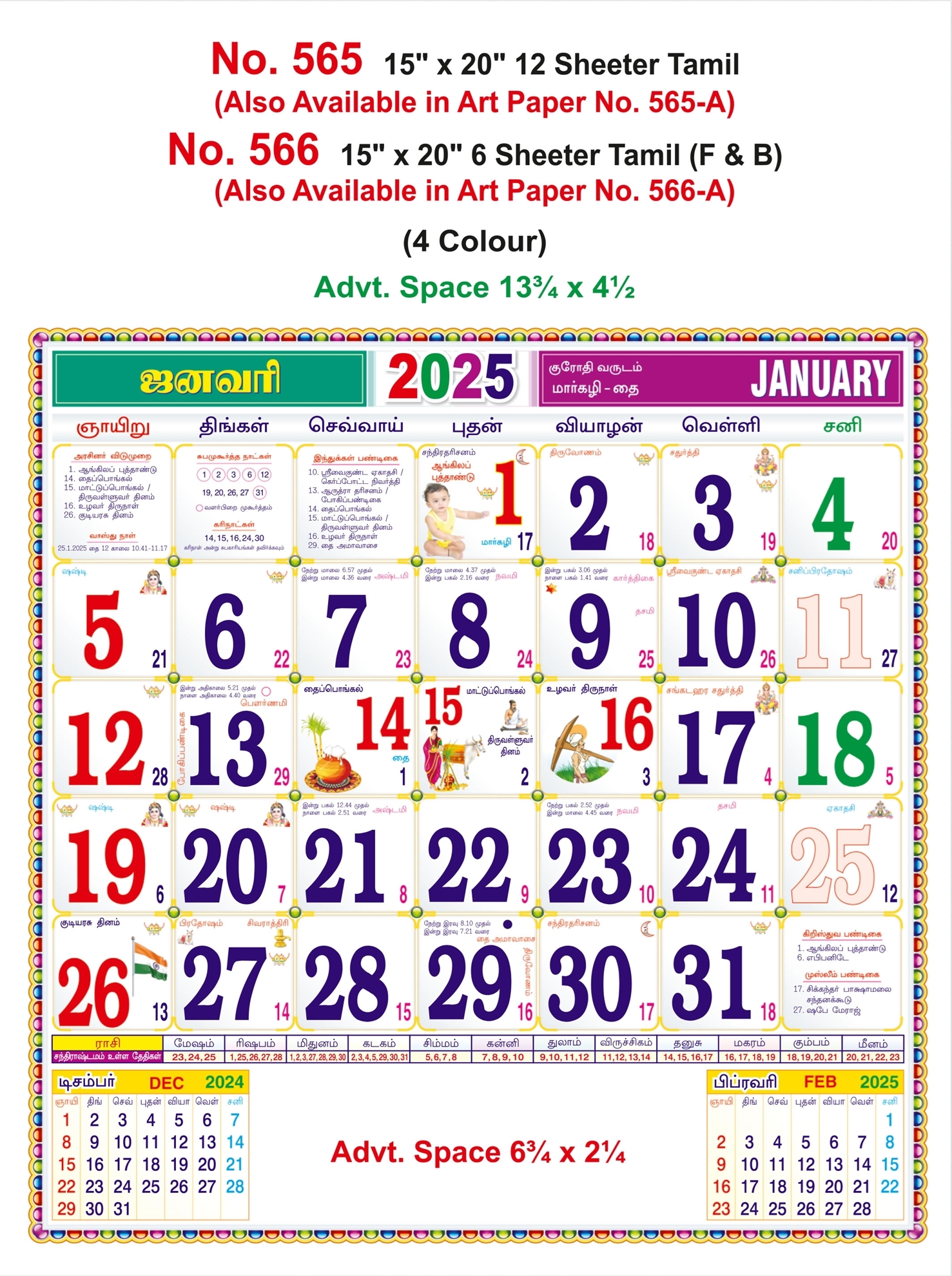 R565 Tamil - 15x20" 12 Sheeter Monthly Calendar Printing 2025