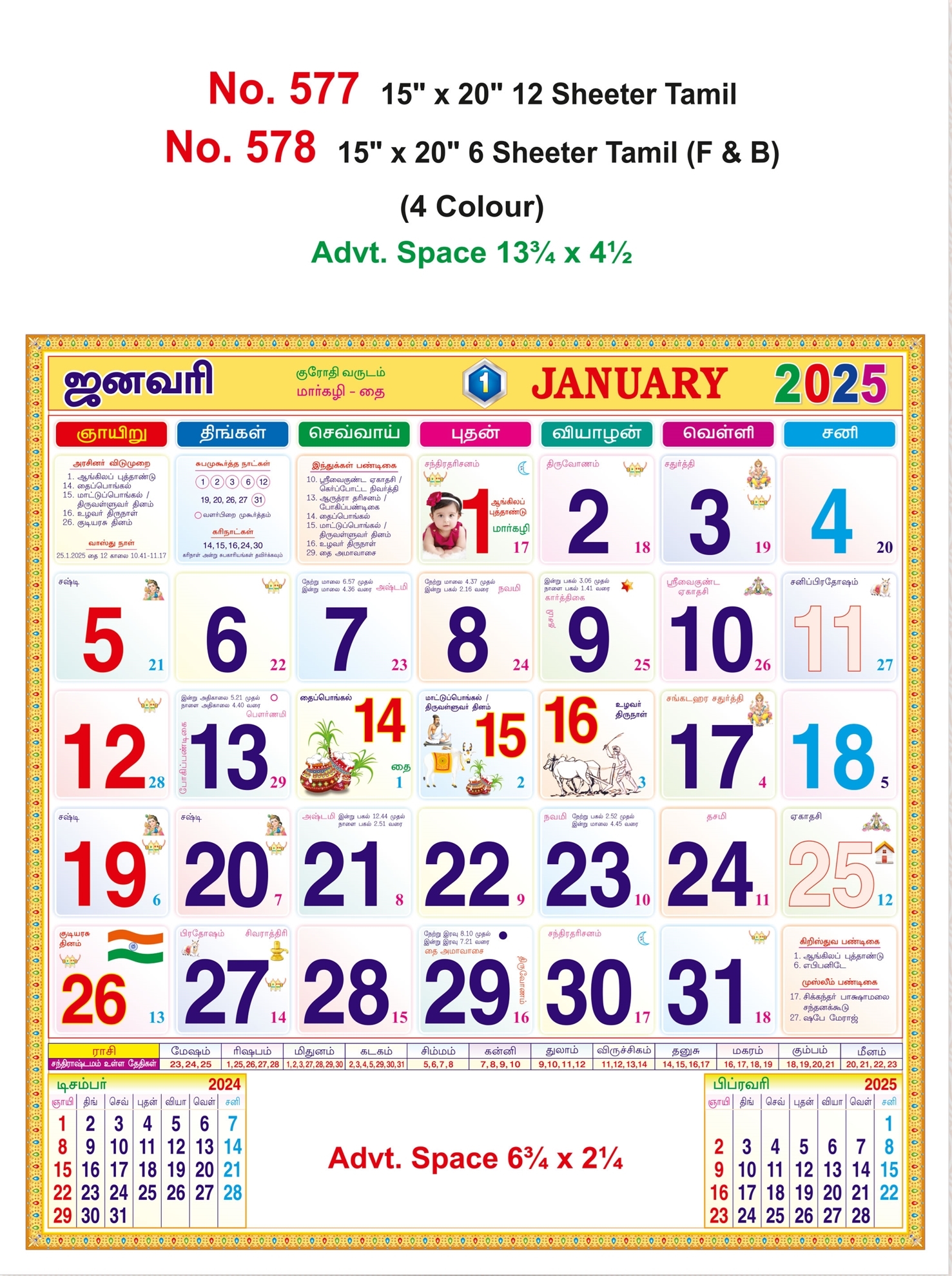 R577 Tamil - 15x20" 12 Sheeter Monthly Calendar Printing 2025