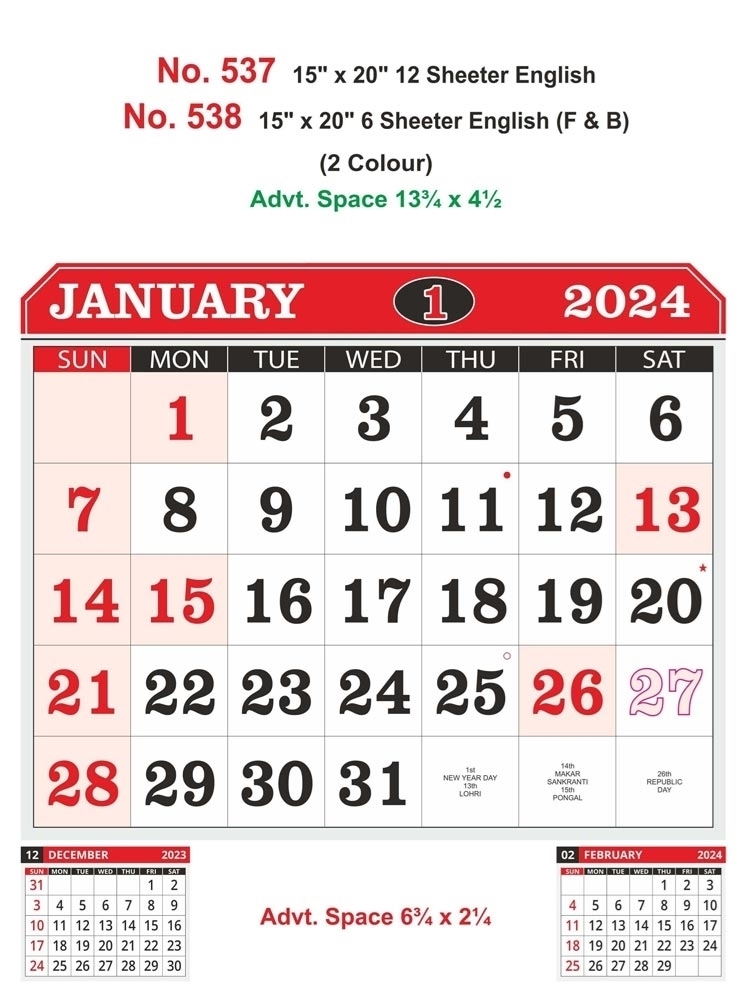 Key Features of R538 English (F&B) - 15x20" 6 Sheeter Monthly Calendar Printing 2024