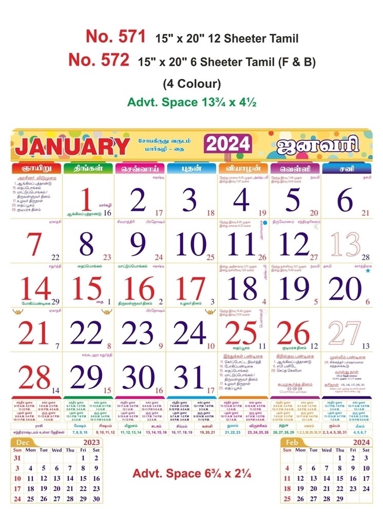 Key Features of R572 Tamil (F&B) - 15x20" 6 Sheeter Monthly Calendar Printing 2024