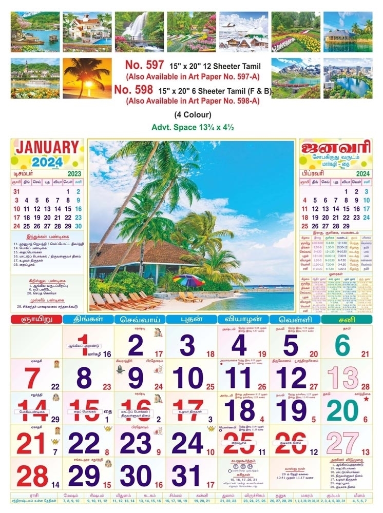 Key Features of R598 Tamil(Scenery) (F&B) - 15x20" 6 Sheeter Monthly Calendar Printing 2024