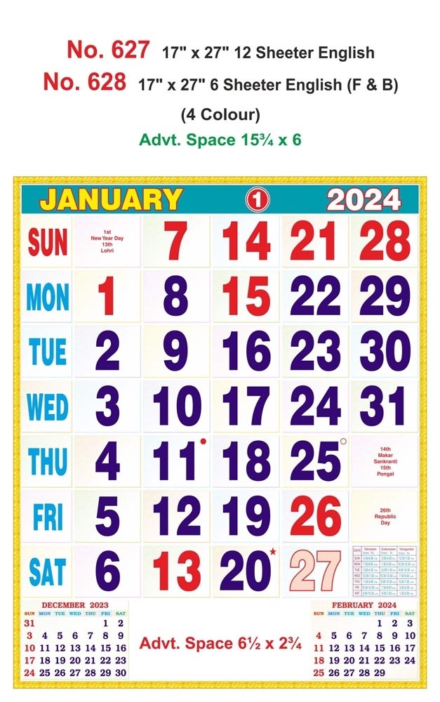 Key Features of R627 English - 17x27" 12 Sheeter Monthly Calendar Printing 2024