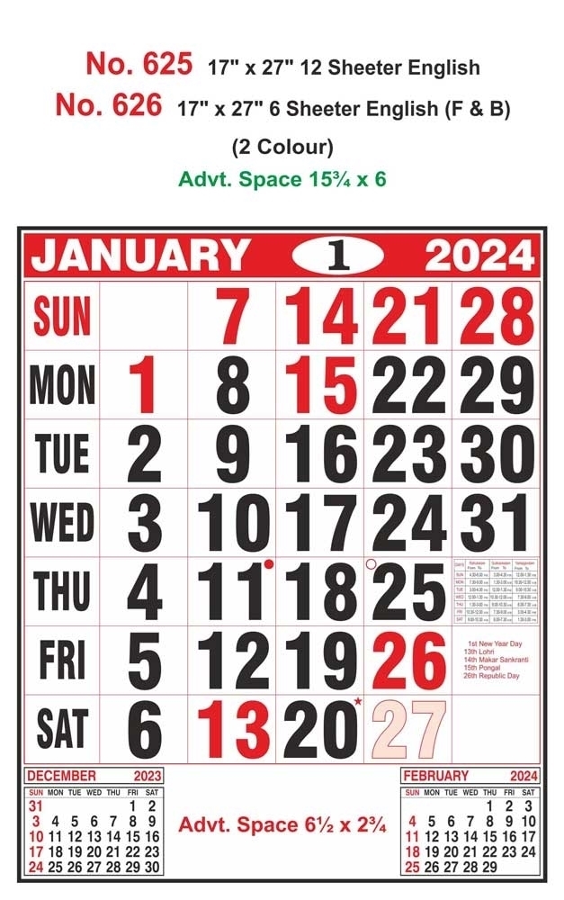 Key Features of R626 English (F&B) - 17x27" 6 Sheeter Monthly Calendar Printing 2024