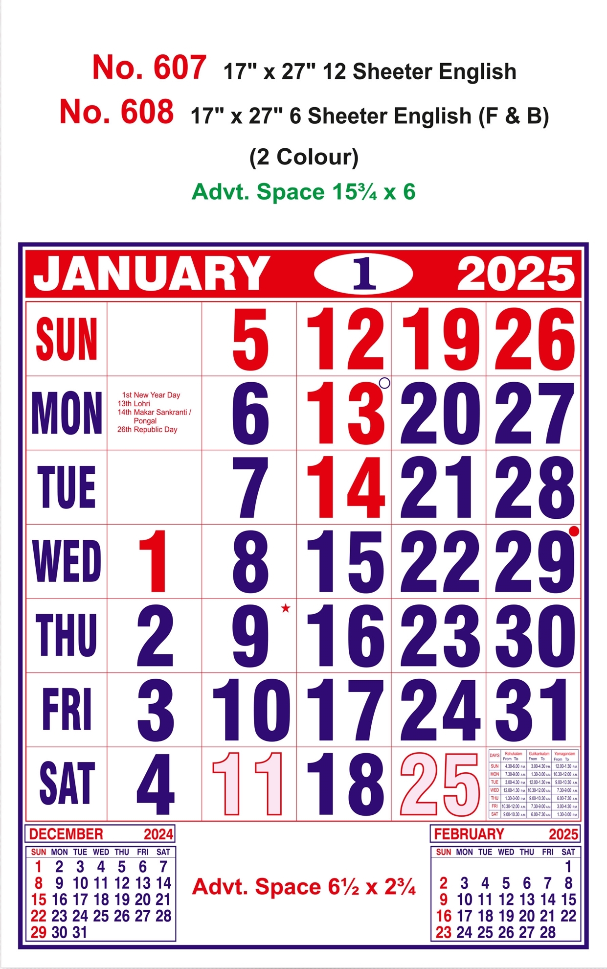 Key Features of R608 English (F&B) - 17x27" 6 Sheeter Monthly Calendar Printing 2025