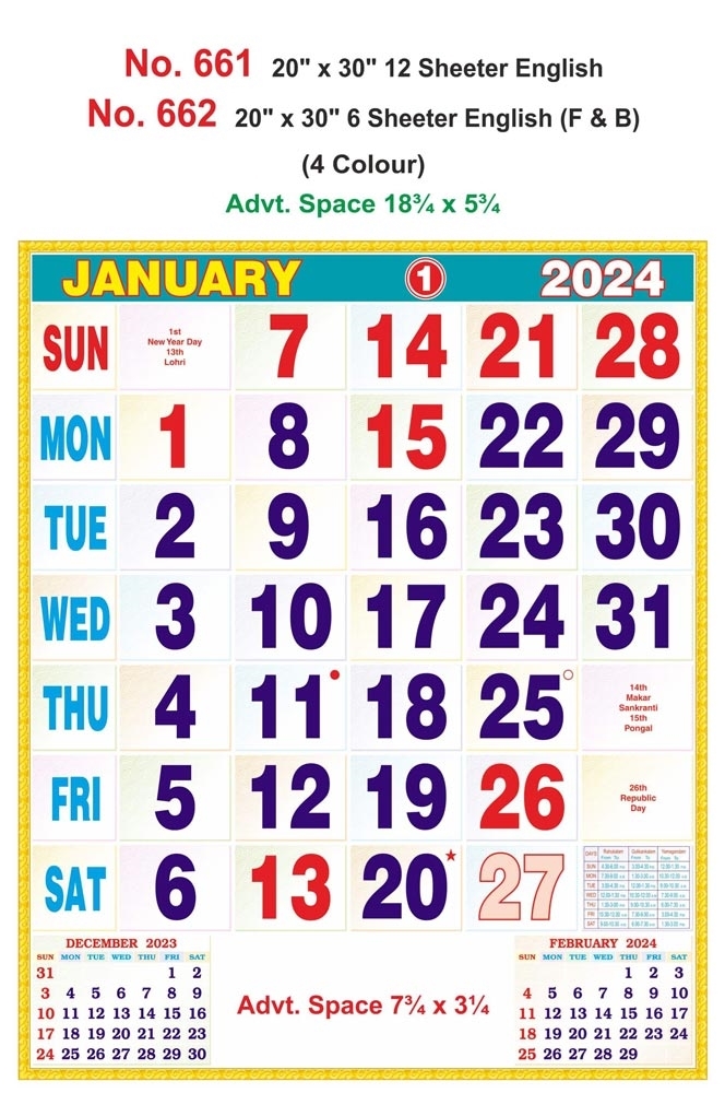 Key Features of R661 English - 20x30" 12 Sheeter Monthly Calendar Printing 2024