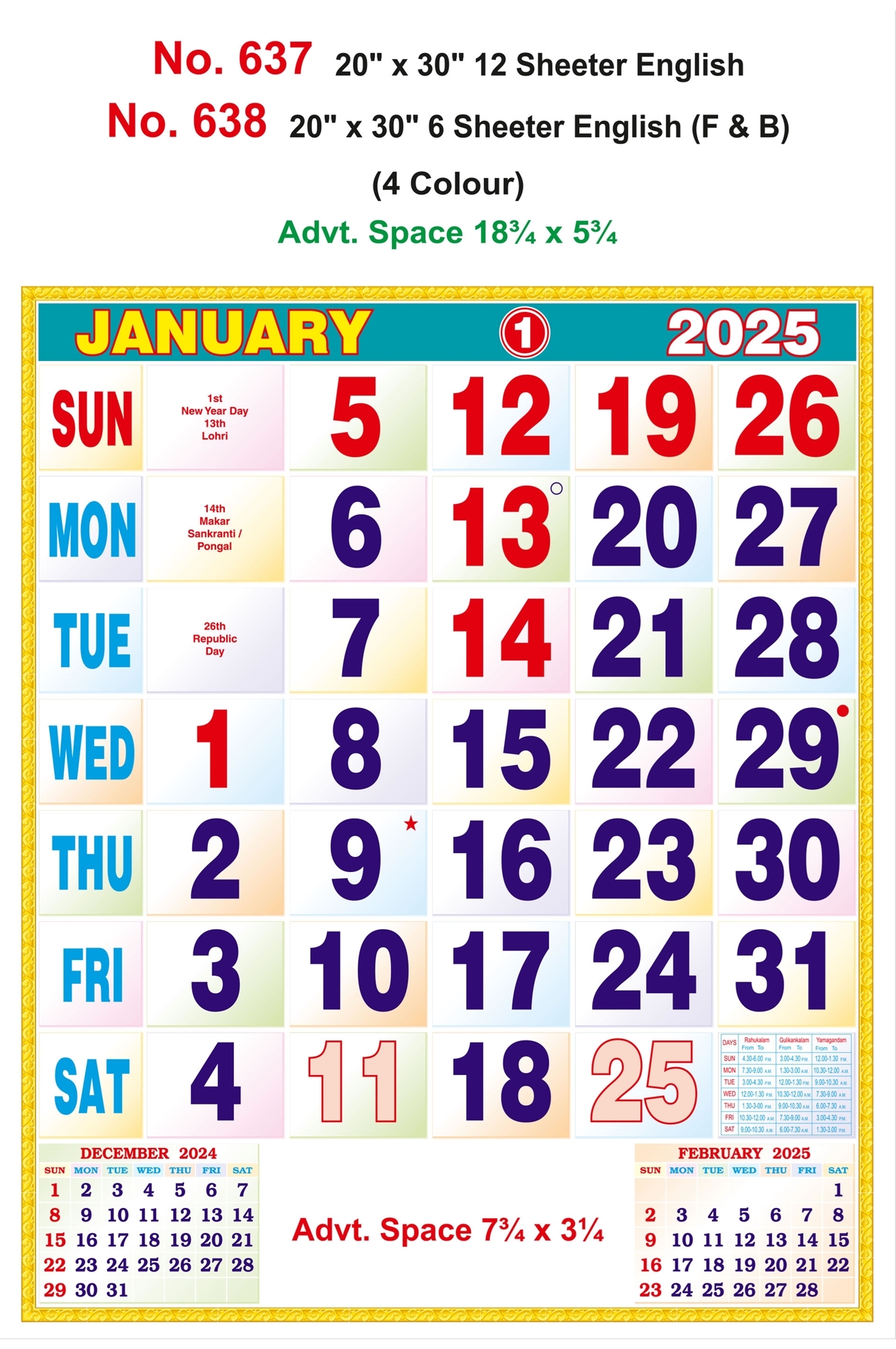 R639 English (NS Paper) - 20x30" 12 Sheeter Monthly Calendar Printing 2025