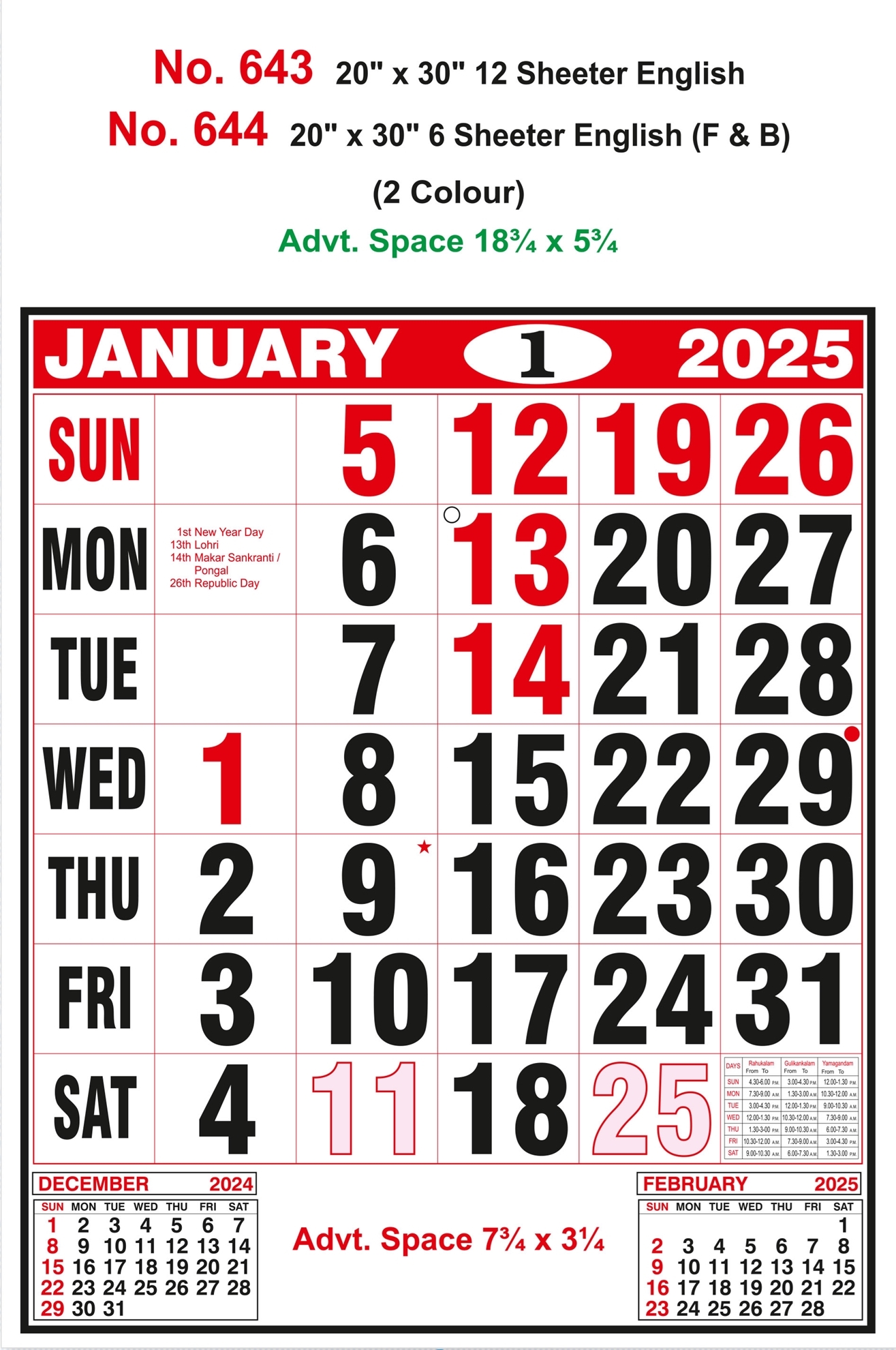 Key Features of R644 English(F&B) - 20x30" 6 Sheeter Monthly Calendar Printing 2025